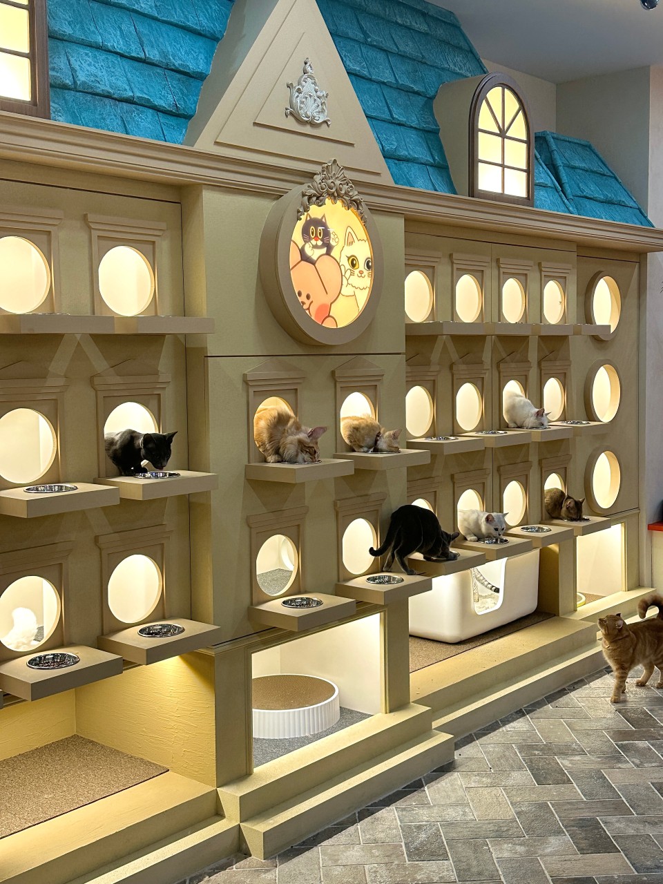 - ✨ What to Expect: This place in the heart of trendy Hongdae is like stepping into a fairytale! It’s designed like a cozy rooftop village. The cats roam freely on elevated roof structures, and you can watch their playful lives from below.