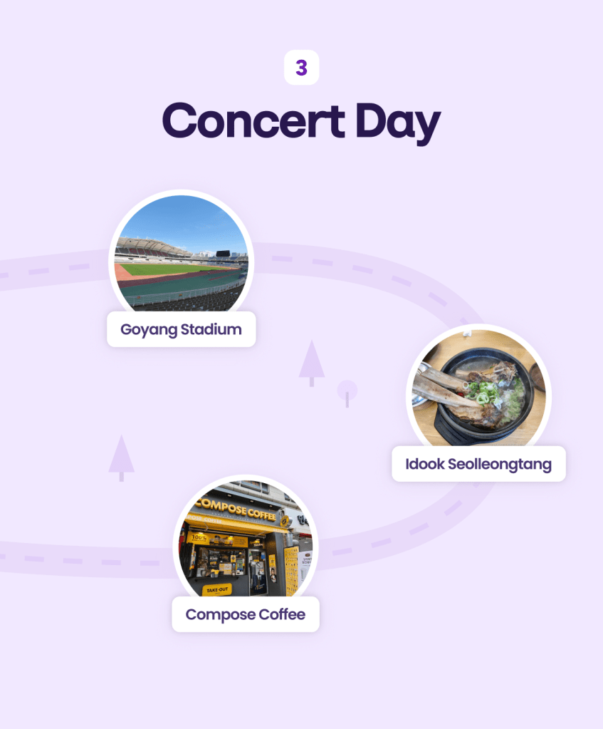 This is the final chapter of our Purple Map of the Show! Whether it’s D-Day for the big performance or you’re just soaking up the pre-concert energy, here is your guide to the Goyang Stadium area—the heart of the show!