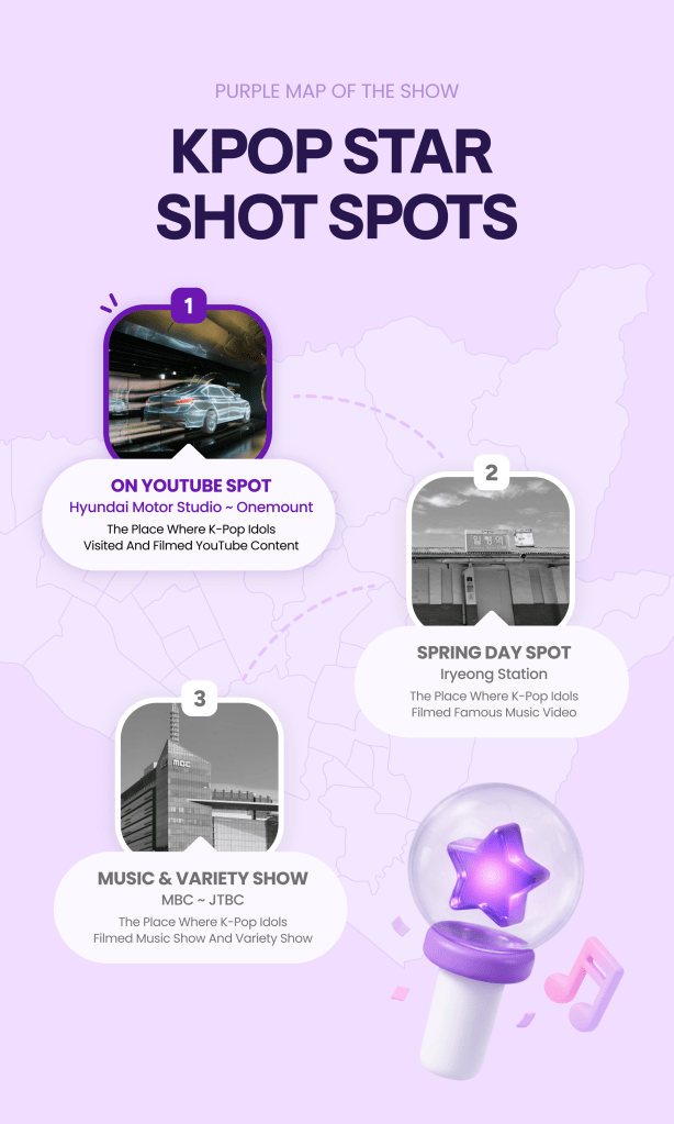 Based on Taxi trip data and fan favorites, i’ve picked the Top 3 Kpop star Shot Spots where you can feel like the main character of a stars story. We’ve also highlighted local-favorite restaurants and cafés near each spot—so keep reading and complete your perfect Kpop trip!